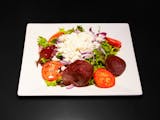 Creamy burrata served on a bed of arugula and prosciutto, topped with diced onions, carrots, cherry tomatoes, grilled eggplant, zucchini, and drizzled with balsamic glaze.